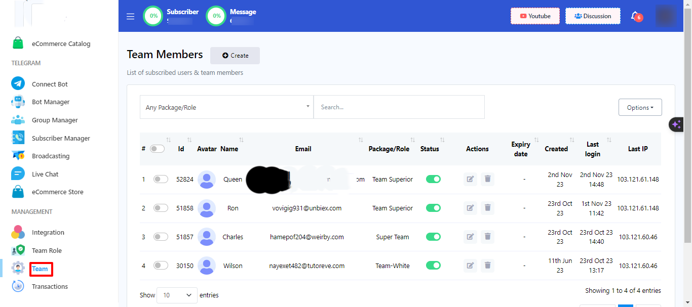 On our platform, a team member is more than just a user.They are specialized individuals with access to a variety of features such as live chat and subscriber management. This role is particularly useful when you have a large number of registered users and need assistance with managing their data or other user-related tasks.