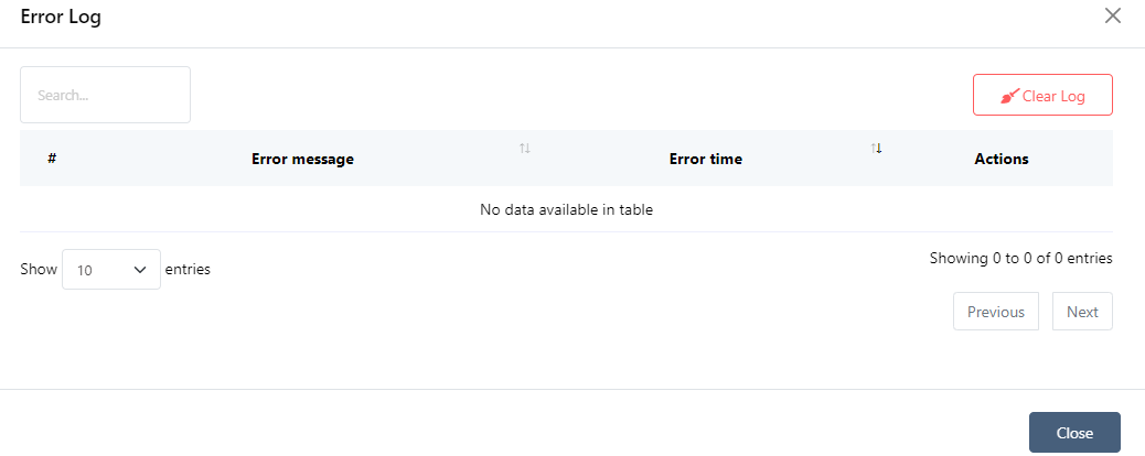 You can access the Bot Error logs from the `Options` button. To clear all error logs, simply click the `Clear Log` button.