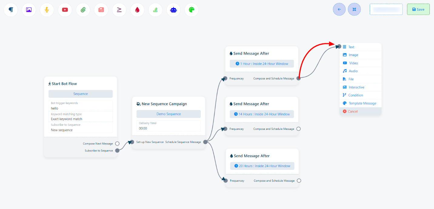 - After setting up the time on the component, the message components that would be sent should be connected to it. These components could include text replies, image replies, audio, or interactive components with buttons, similar to the process of creating a bot reply.