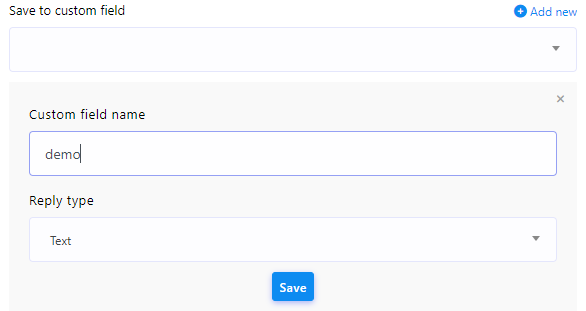 - Save to custom field: You have the option to store the answer data in a specific data table that you specify. If you require a new custom field, it can be created by clicking the `Add New` button.