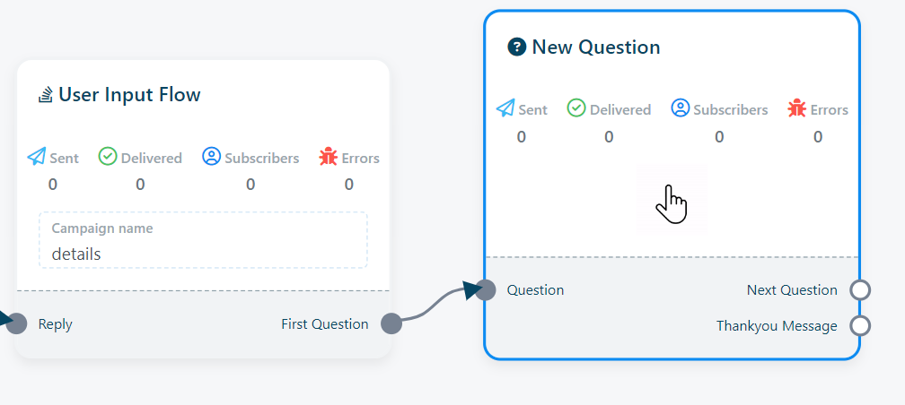 - After saving the `User Input Flow`, a `New Question component will automatically appear in the flow. Alternatively, you can drag the socket named `First question` and place it in your bot flow to reveal the `New Question` component.
