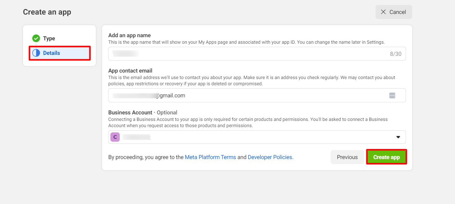 In the Display name field, add a display name for your business account. In the App Contact Email field, provide an Email address.