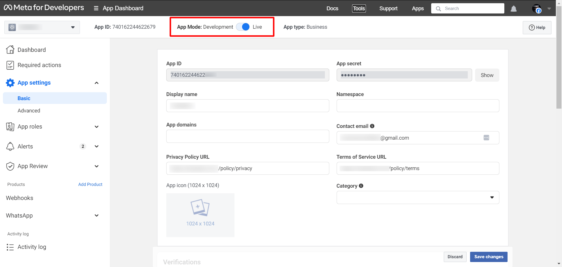Then from the App settings, click on the Basic option and add the Privacy Policy URL and Terms of Service URL from the Tawasul Automation. These URLs are available on the Connect bot page of Tawasul Automation. After adding these URLs just click on the “Save changes” button.