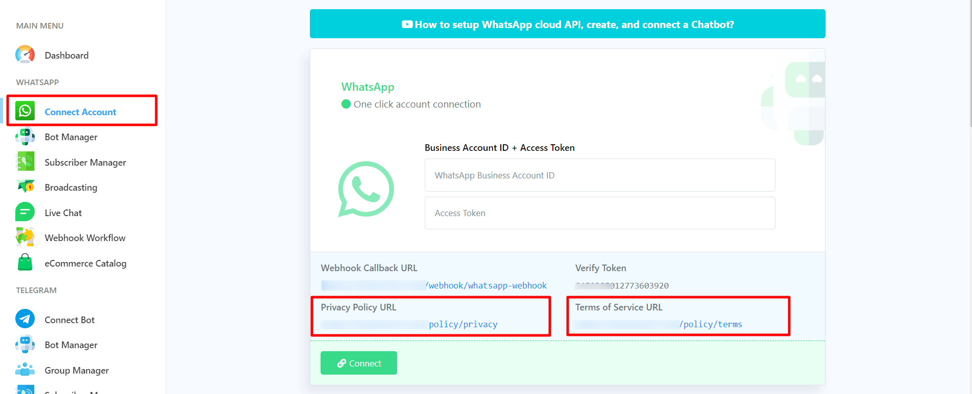 To get the callback URL and verify the token from Tawasul Automation. Login to your account and go to the dashboard of Tawasul Automation. At the left sidebar of the Dashboard, under the WhatsApp section, you will see connect WhatsApp option. Now click on the connect WhatsApp menu and instantly, Connect WhatsApp Business page will appear.